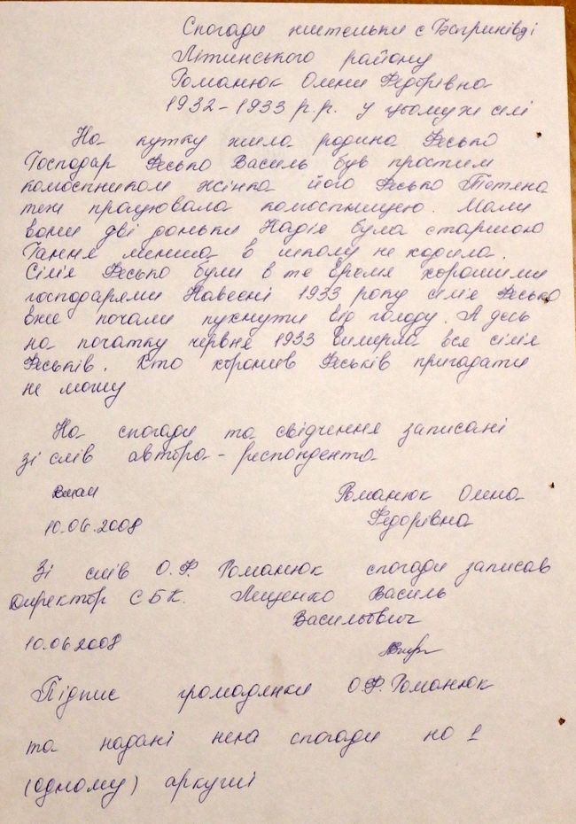 В семье соседа Гичака Григория было 8 человек, от голода умерли 7 членов семьи, остался жив один сын. В семье Терлецкой Анастасии было пять детей и двое родителей, остались живы только две сестры, все умерли от голода. В семье Андрусяк Феклы умерли от голода трое детей. Есть было нечего. Помню, у пруда жила женщина, которая вылавливала кошек, собак, чтобы прокормиться. Родители пугали детей туда не ходить, потому что и их поймают. Фактов и доказательств, что она вылавливала детей, не было».