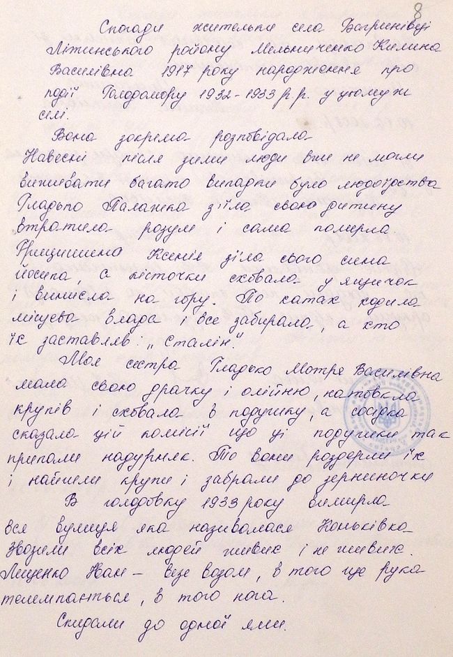 Архивисты говорят, что собранные материалы показывают человеческую сторону той трагедии. Они позволяют именно в человеческом измерении определить предпосылки трагедии, методы и технологии совершения геноцида, проанализировать демографические последствия. Так, в воспоминаниях Никифора Микитюка, 1927 года рождения, из села Крикливец речь идет о том, что его семью спасла корова, а вот соседи умирали один за другим: «Моя семья голодала не очень, родители держали корову, которая кормила нас и поддерживала соседей, которые очень голодали.