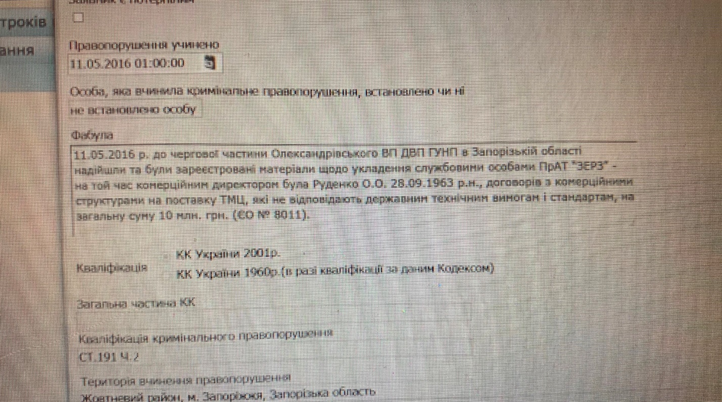 Як зазначено у фабулі одного з кримінальних проваджень під час перебування Руденко О.О. на посаді комерційного директора ЗЕРЗ здійснювались закупівлі ТМЦ, які не відповідають державним технічним вимогам і стандартам, на загальну суму 10 млн грн.