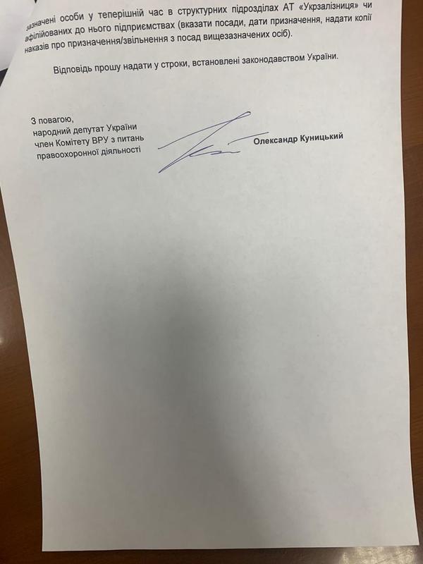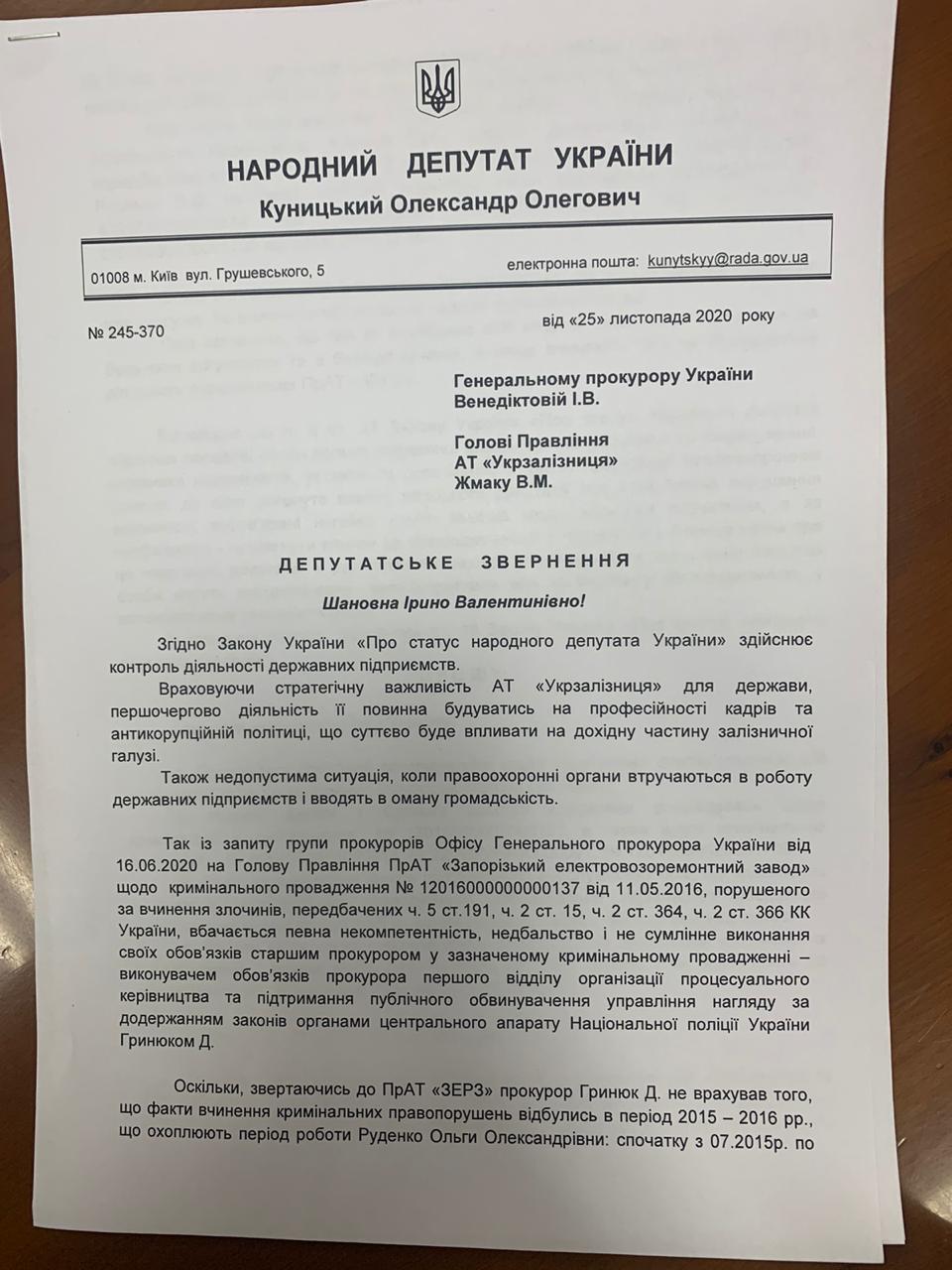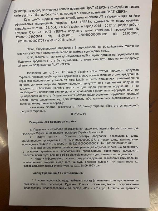 Слід зазначити, що до Голови Правління Укрзалізниці, звертались також народні депутати, акцентуючи увагу на протиправній діяльності Ольги Руденко.