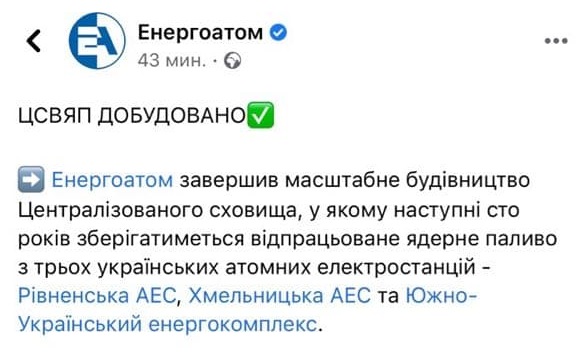 Але, як не дивно, компанія «Енергоатом» уже офіційно заявила про завершення будівництва ЦСВЯП.