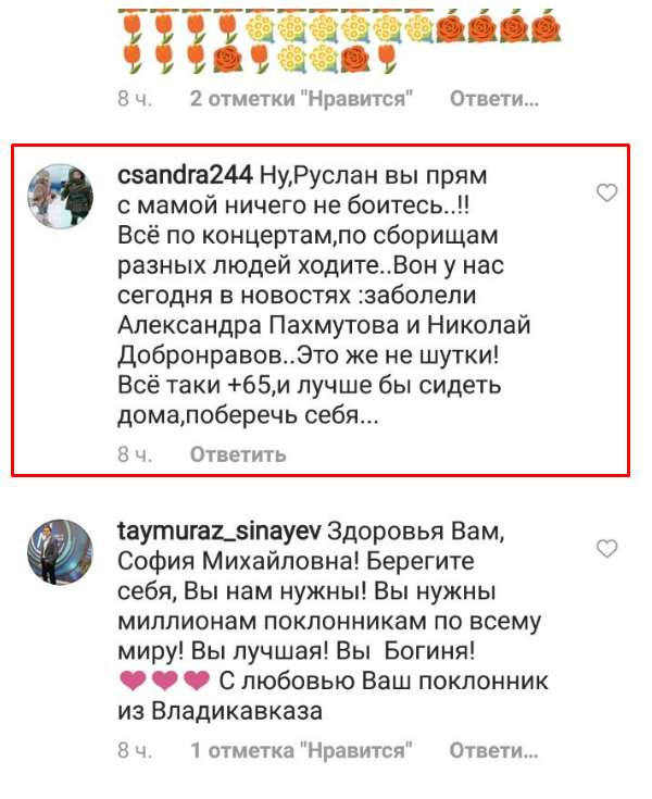 Помимо массы «сердечек» и «лайков» Руслан Евдокименко получил и предупреждение — ему посоветовали поберечь маму и меньше бывать с ней в публичных местах из-за пандемии коронавируса, который особо опасен для людей в возрасте. Сыну Ротару напомнили, что с «короной» в больницу попали композитор Александра Пахмутова и ее муж, поэт Николай Добронравов.