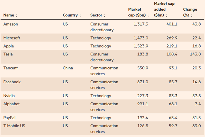 Згідно з дослідженням Financial Times «Процвітання в умовах пандемії», на першому місці в рейтингу зі 100 світових компаній – американська Amazon, яка і у 2019 році обійшла Microsoft і Apple в списку найдорожчих брендів у світі. За час карантину капіталізація компанії зросла на $401 млрд. (До епідемії вона становила $916 млрд, зростання – майже 44%, дивіться інфографіку).