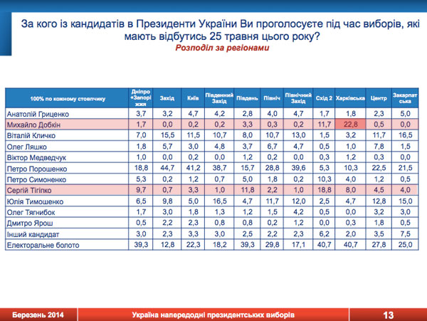 Весь всеукраинский рейтинг Добкина (4,2%) держится на Харьковской области – 23%, тогда как рейтинг Тигипко (7,3%) более равномерный по стране.