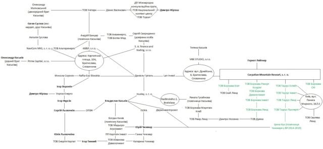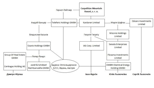 Словацкая компания Carpathian Mountain Resort, s. r. o. зарегистрирована в Братиславе на ул. Дунайской, 8. По этому же адресу прописаны компания Vibe Studio, s. r. o., владелицей которой является Татьяна Каськив, а также Lán Invest jsa, владельцем которой является словацкий юрист Даниэль Григель.