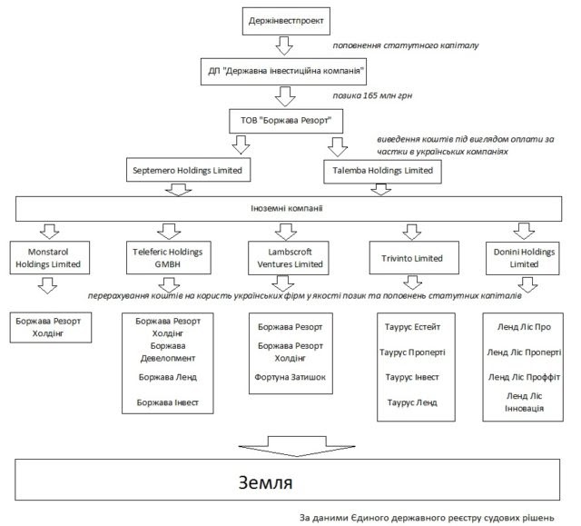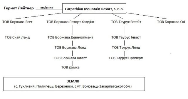 Таким образом, как удалось установить по данным госреестра, владельцами 495 участков общей площадью 450 га в районе Боржавы является «Боржава Девелопмент», «Боржава Ленд», «Боржава Инвест», «Таурус Проперти», «Таурус Инвест», «Таурус Ленд» и «Свалява Ленд». Кроме того, еще две связанные компании - «Боржава Ски» и «Скай Ленд» - обладают рядом 15 гектарами. Сегодня конечным владельцем всех этих компаний является Carpathian Mountain Resout, s.r.o, руководителем которой является Гернот Ляйтнер. Все они прочно переплетаются с Каськивым и ведут к группе Левочкина-Фирташа. Подробнее о бенефициарных связях см. ниже.