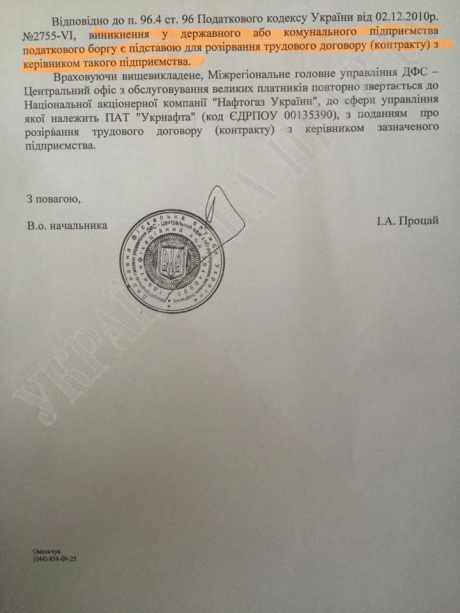 "Міжрегіональне головне управління ДФС – Центральний офіс з обслуговування великих платників повторно звертається до Національної акціонерної компанії "Нафтогаз України", до сфери управління якої належить ПАТ "Укрнафта" … з поданням про розірвання трудового договору (контракту) з керівником зазначеного підприємства", – йдеться у документі.