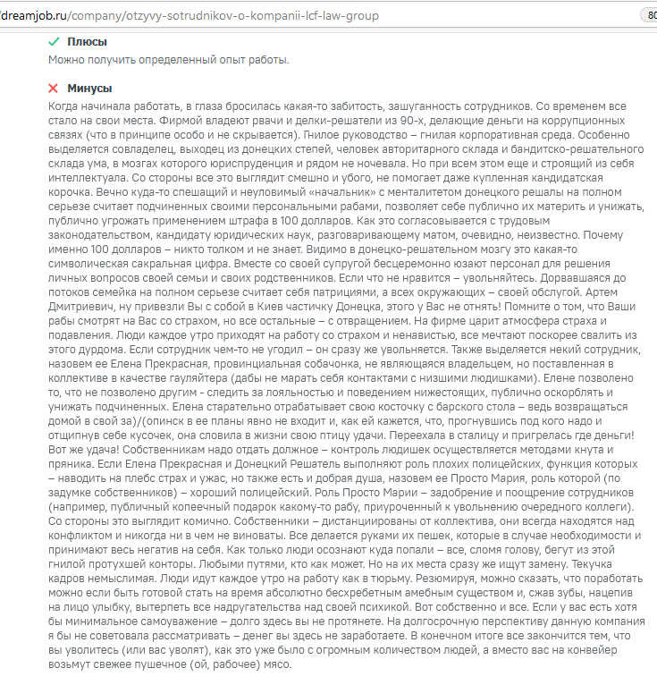 «Гнилое руководство – гнилая корпоративная среда. Особенно выделяется совладелец, выходец из донецких степей, человек авторитарного склада и бандитско-решательного склада ума, в мозгах которого юриспруденция и рядом не ночевала. Но при всем этом еще и строящий из себя интеллектуала», – говорит автор отзыва. – «Вечно куда-то спешащий и неуловимый «начальник» с менталитетом донецкого решалы (речь идет об Артеме Стоянове, старшем партнере ЮГ LCF - прим.авт.) на полном серьезе считает подчиненных своими персональными рабами, позволяет себе публично их материть и унижать, публично угрожать применением штрафа в 100 долларов. Как это согласовывается с трудовым законодательством, кандидату юридических наук, разговаривающему матом, очевидно, неизвестно…»