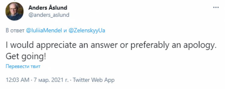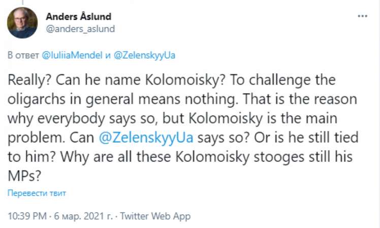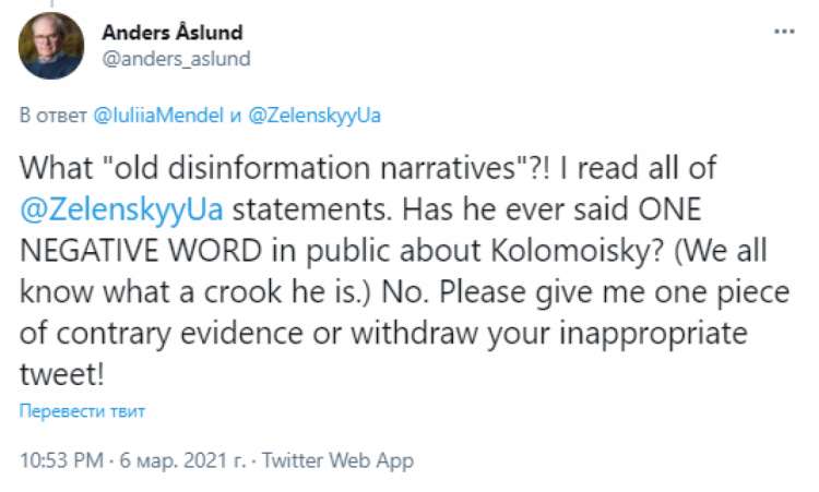 “Які “старі наративи дезінформації”?! Я прочитав всі заяви Володимира Зеленського. Сказав він коли-небудь публічно хоч одне негативне слово про Коломойського? (Всі ми знаємо, який він шахрай.) Ні. Будь ласка, надайте докази зворотного або приберіть свій неприйнятний твіт!”, – відповів Аслунд.