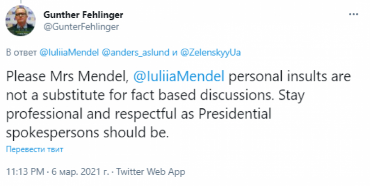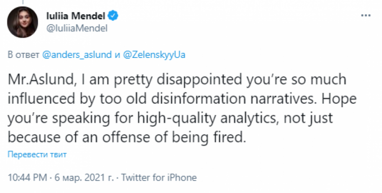 Мендель відповіла, що Аслунд, очевидно, пише це під впливом “старих наративів дезінформації”, а також тому, що його “звільнили”.
