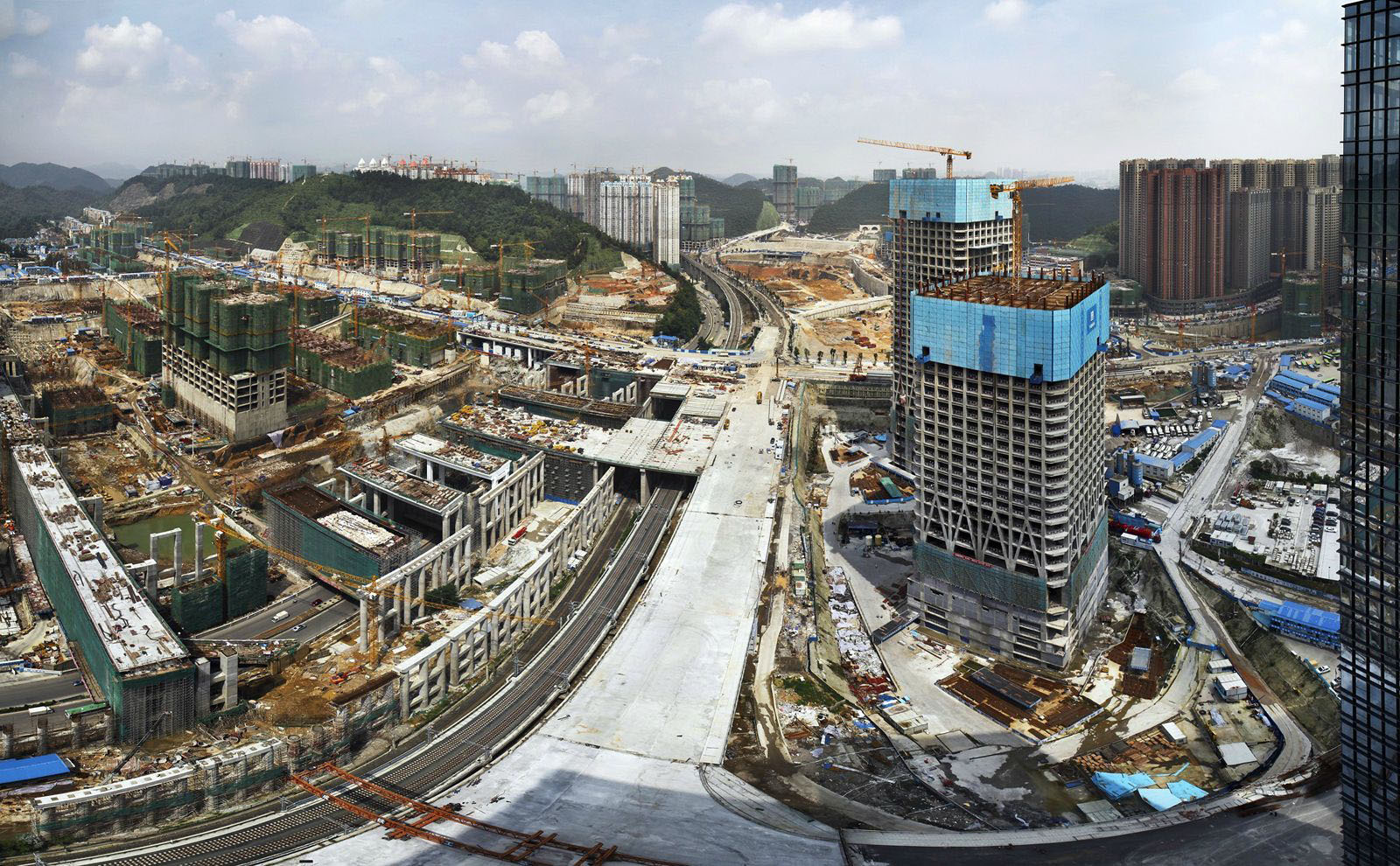 Вот как выглядит типичная китайская стройка в городах миллионниках на примере города Гуянь (все фотографии в этой теме кликабельны). Думаю нашим строителям и инженерам стоит рассмотреть этот снимок повнимательнее и изучить передовой зарубежный опыт масштабного и динамичного строительства.