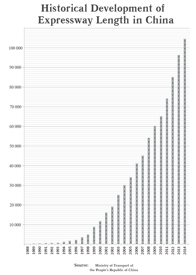 До 1987 года в Китае не было ни одного километра скоростных автомагистралей. По первоначальному плану Китай собирался построить сеть из национальных магистралей на 35000 км только к 2020 году. Но уже на 1 января 2005 года общая длина дорог приблизилась к этой цифре. А в 2011 году Китай превзошел Национальную систему межштатных автомагистралей (Eisenhower National System of Interstate and Defense Highways), строившуюся с 1956 года и казавшуюся недосягаемой по своим масштабам. В последние годы американская сеть дорог практически остановилась в своем развитии. Для примера за 2012-2013 год она увеличилась с 76788 км до 77017, то есть на 229 километров.