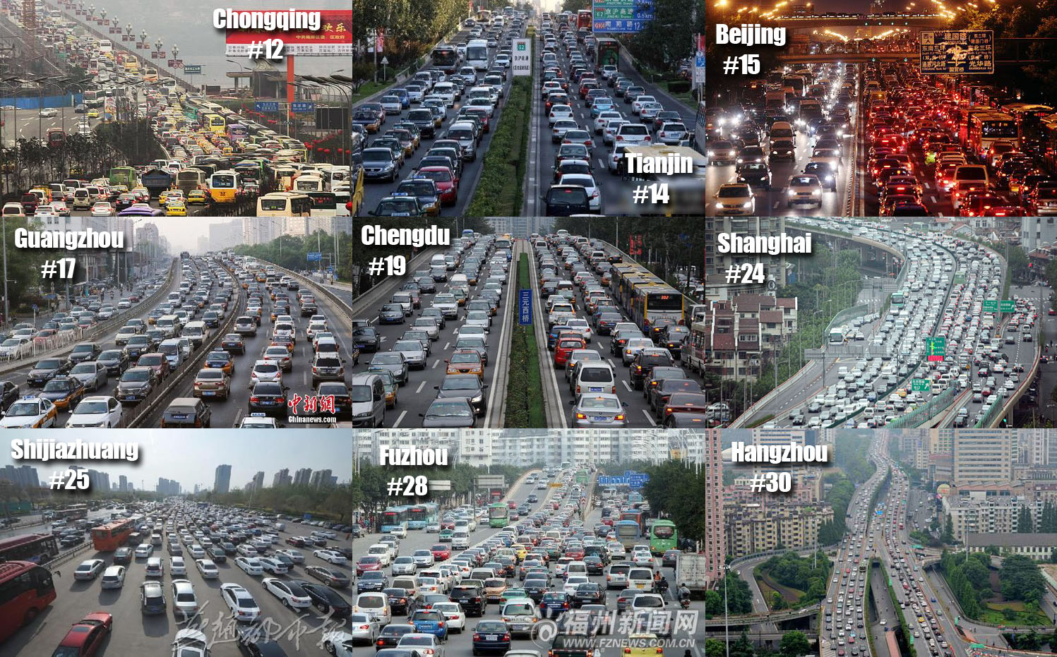 Компания TomTom, занимающаяся навигационными продуктами, недавно опубликовала свой ежегодный рейтинг загруженности городских дорог в часы пик — TomTom Traffic Index. В 2014 году в этот рейтинг впервые были включены города Китая. По оценкам компании TomTom, 10 китайских городов вошли в первую 30-ку мировых лидеров автомобильных пробок. Вот эти города (в скобках занятое ими место в рейтинге):