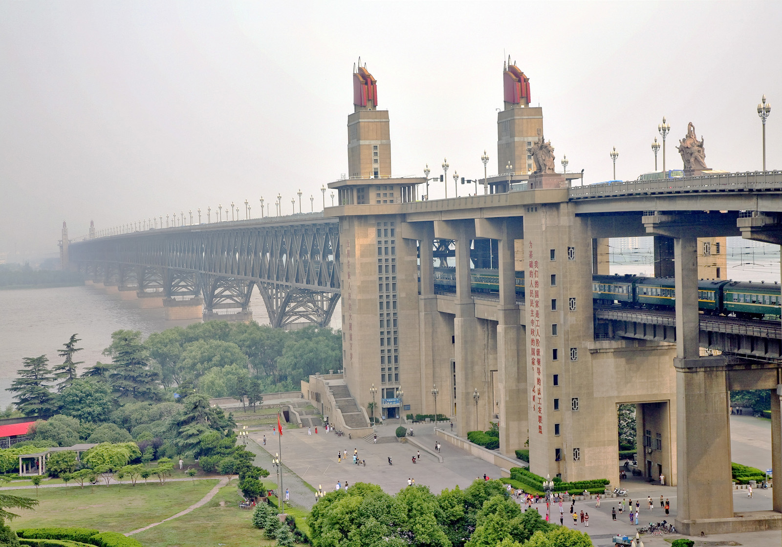 До 1957 года через Янцзы не было построено ни одного моста.»Первый мост», его так и называют, был построен в 1957 году в сотрудничестве с инженерами из СССР. Правда, им пришлось уехать, не закончив работу, из-за возникших политических разногласий между нашими странами. Мост двухъярусный — на нижнем ярусе располагается железнодорожная магистраль, на верхнем четырехполосная автострада. Кроме того на мосту находится даже музей, рассказывающий о истории создания первой переправы через Янцзы. Возможно будущий мост в Крым будет в какой-то степени копией этого моста.