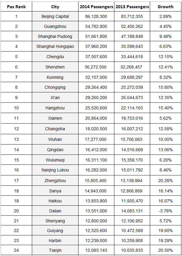 Пассажиропоток китайских аэропортов по итогам 2014 года: