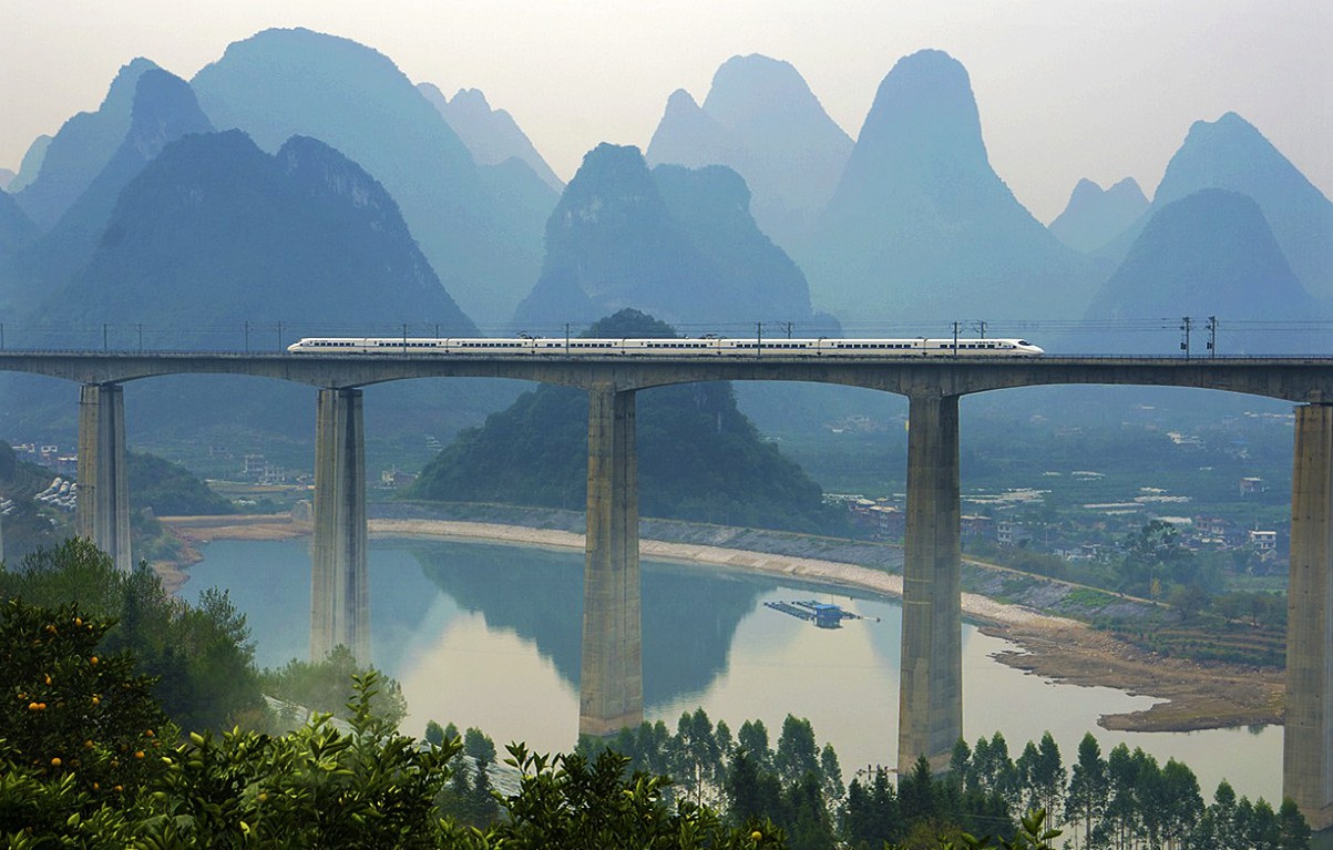 Высокоскоростная магистраль Гуанчжоу-Гуйян. Со скоростью 250 км в час поезд проносится через 510 мостов и 236 туннелей.