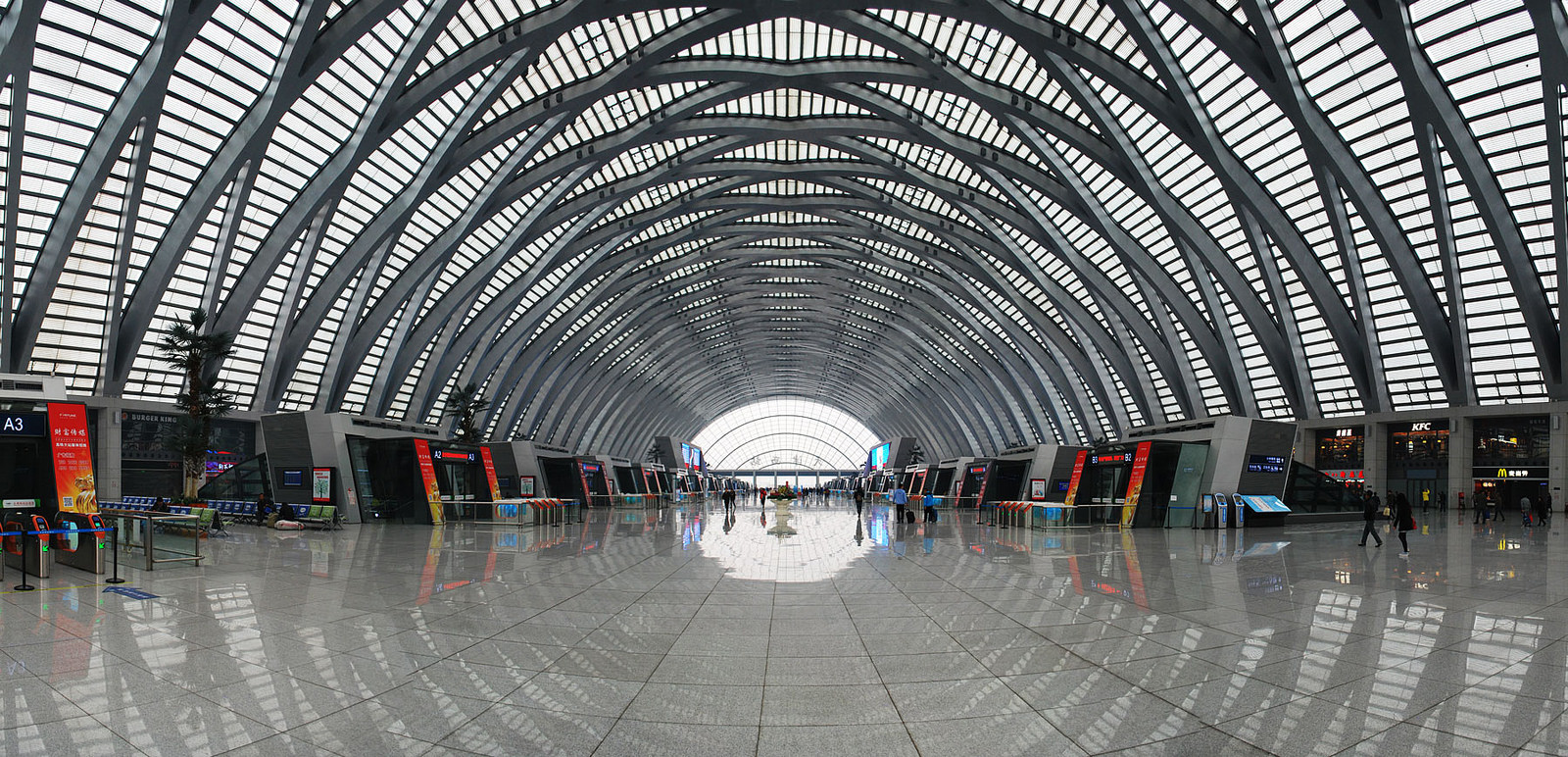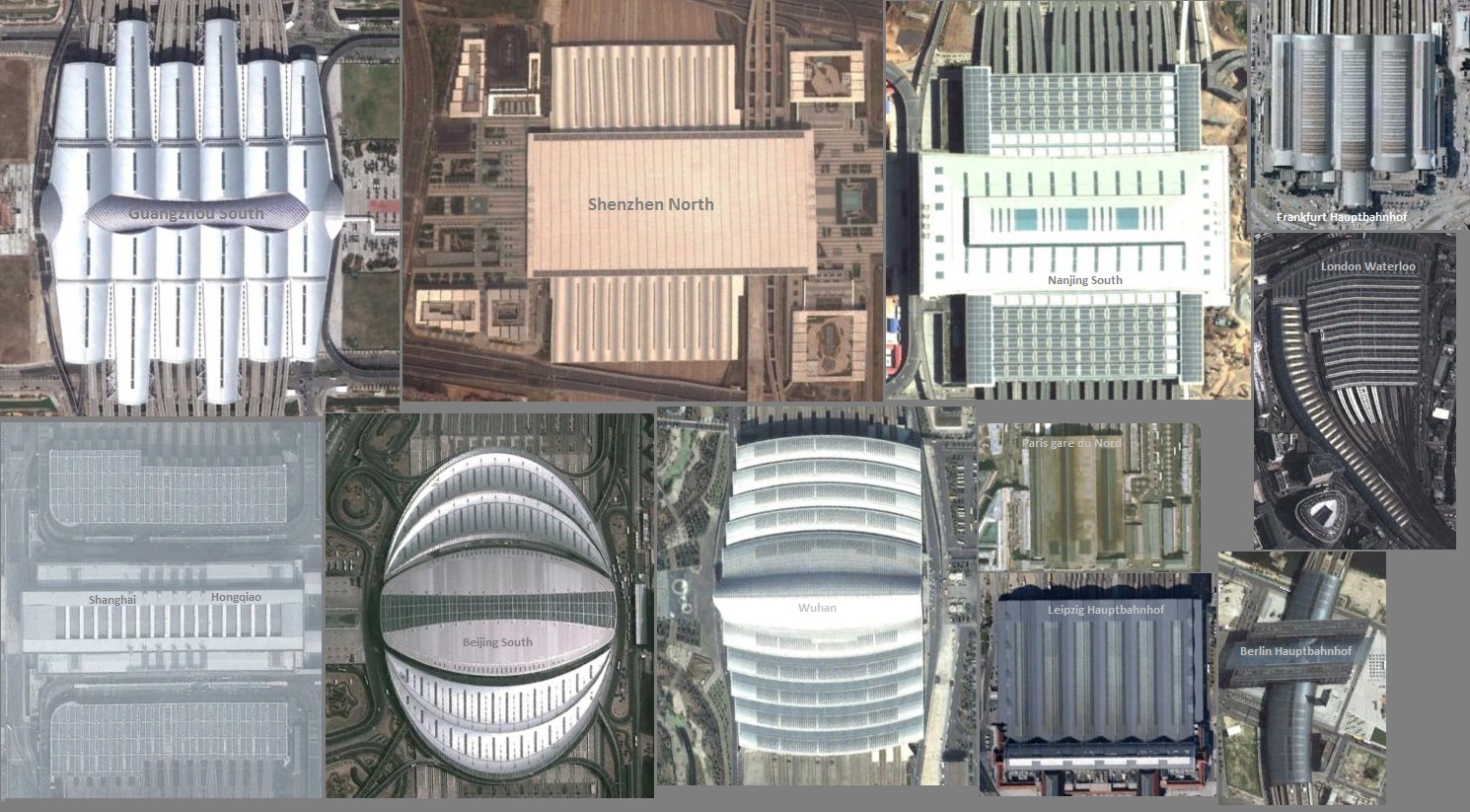 Китайские железнодорожные вокзалы поражают своими размерами и архитектурой пожалуй даже больше чем аэропорты. На этой карте представлены в одном масштабе крупнейшие китайские вокзалы (слева), в сравнении с крупнейшими железнодорожными вокзалами Европы (в нижнем правом углу):