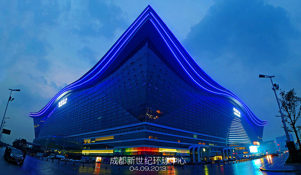 Как думаете в каких годах сделаны эти фотографии? В 70-х или в 80-х? Вы наверное удивитесь, но это фото 1999 года. За каких то 15 лет город изменился до неузнаваемости. Знаете где находится самое большое здание в мире? Думаете вашингтонский Пентагон или Дубайский аэропорт? Нет, в 2013 году пальма первенства перешла Чэнду. Новый мировой лидер — New Century Global Centre по площади почти в три раза превосходит Пентагон. Его высота 100 м, а стороны 500Х400 м. Внутри находится самый большой искусственный пляж в мире с искусственными волнами, искусственным солнцем и даже искусственным легким морским бризом.