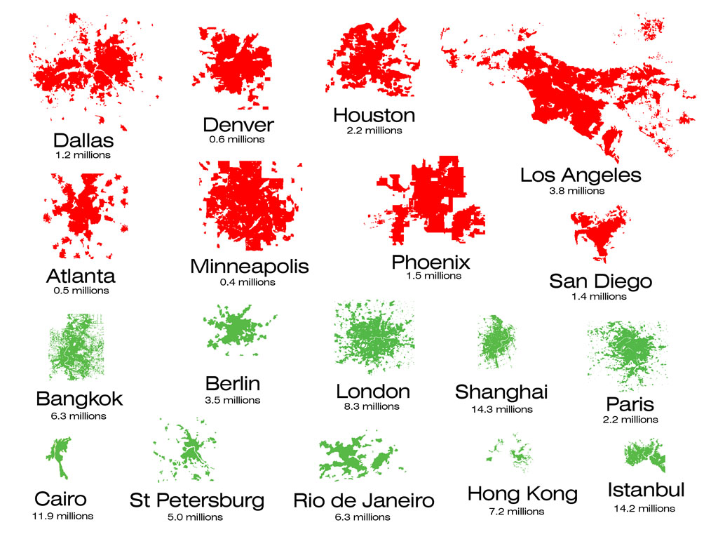 Благодаря подобной застройке, города США имеют поистине циклопические размеры. Чтобы оценить масштабы, приведу сравнительную карту американских городов (красные) и крупнейших мировых мегаполисов (зеленые):