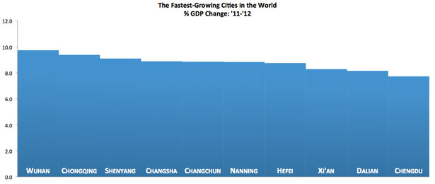 По данным компании MetroMonitor, занимающейся мониторингом 300 крупнейших городов мира в 2012 году из 20 наиболее быстро растущих городов мира 19 были китайскими.