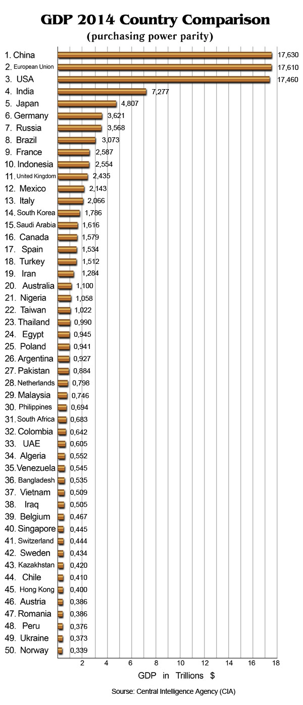 Сравнение ВВП крупнейших 50 стран мира по данным справочника ЦРУ за 2014 год: