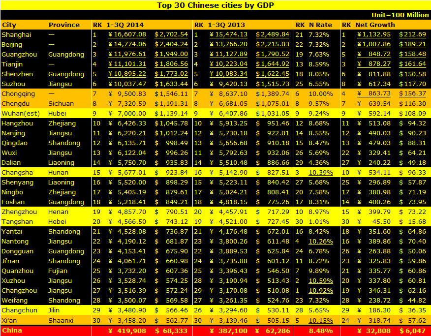 Но несмотря на то что сам Китай уже не развивается теми стремительными темпами что были раньше, тем не менее еще остались в стране города демонстрирующие и восемь, и девять, и даже десять процентов роста. Статистики по итогам всего года мне дождаться так и не удалось, поэтому будем довольствоваться только первыми тремя кварталами 2014 года.