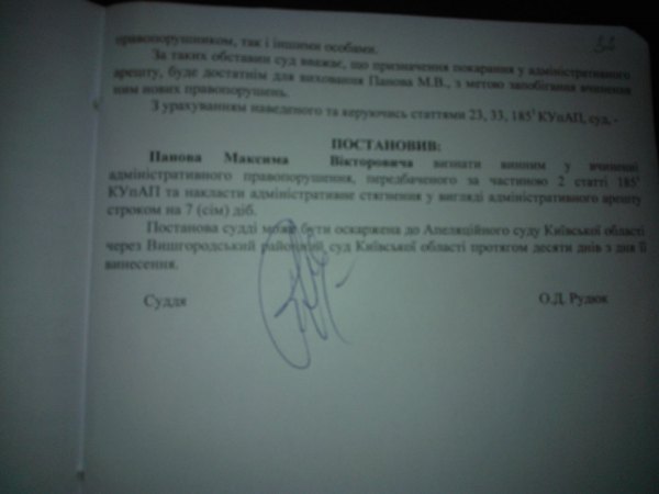 Кроме того, в апреле 2013 года Рудюк принимал решение об административном аресте Максима Панова, главы Киевской организации партии "Демократический альянс" за пикетирование Национального музея коррупции им. В.Ф. Януковича "Межигорье", о чем здесь же, в блоге на "Украинской правде", писала представитель "Демальянса" Наташа Соколенко.