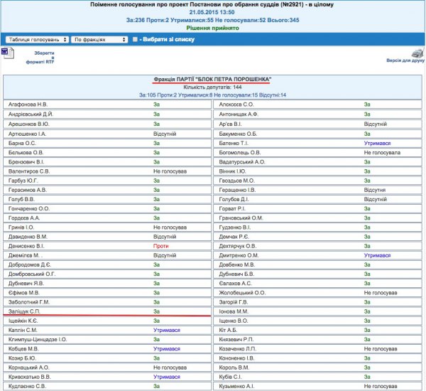 21 мая украинские парламентарии проголосовали за Постановление Верховной Рады N479-VIII "Об избрании судей". "За": 236, "Против": 2, "Воздержались": 55, "Не голосовали": 52 – вот результаты голосования за указанный нормативный акт.