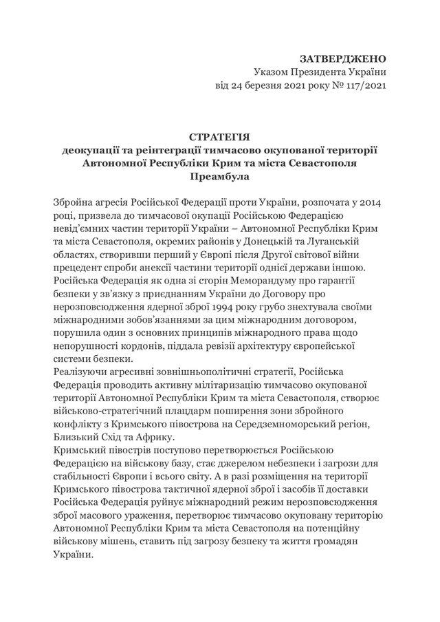 В среду, 24 марта, Владимир Зеленский утвердил Стратегию деоккупации и реинтеграции временно оккупированного Крыма. Своим указом президент ввел в действие решение СНБО от 11 марта.