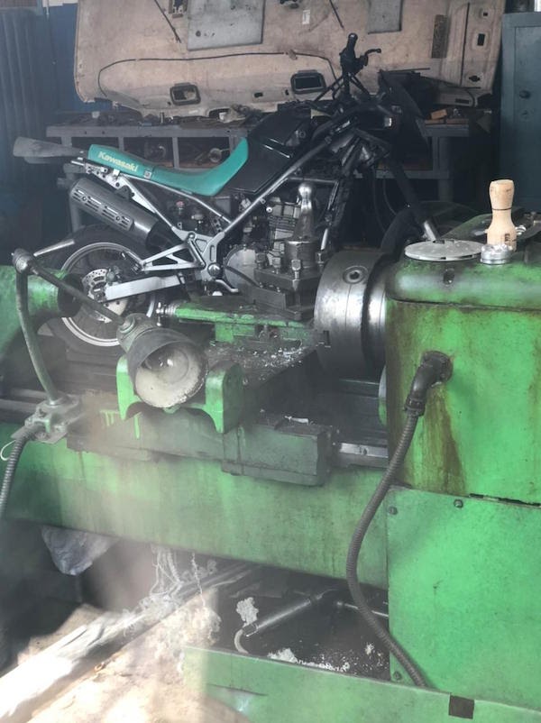 Еще советский токарный станок шедеврально смотрится на фоне модерного “Кавасаки”, ждущего ремонта: