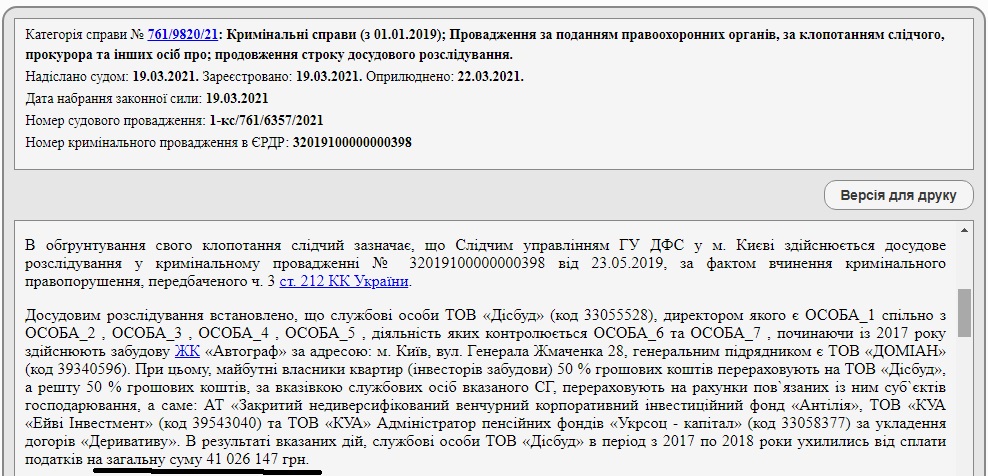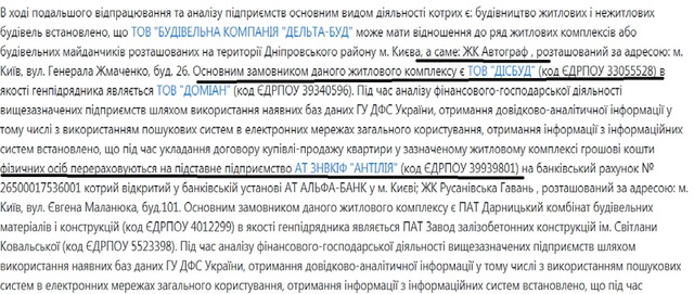 Что касается еще одного дела – за № 12018100040007894, то оно возбуждено в августе 2018 года по статье 191 УК – «Присвоение, растрата имущества или завладение им путем злоупотребления служебным положением». Фабула там довольно сложная, но суть все та же: вот выдержка из материалов уголовного дела: «установлено, что ООО «СТРОИТЕЛЬНАЯ КОМПАНИЯ «ДЕЛЬТА-БУД» может иметь отношение к ряду жилых комплексов или строительных площадок расположенных на территории Днепровского района Киева, а именно: ЖК «Автограф». Основным заказчиком данного жилого комплекса является ООО «ДИСБУД», в качестве генподрядчика выступает ООО «Домиани». При анализе финансового-хозяйственной деятельности вышеупомянутых предприятий путем использования имеющихся баз данных ГУ ДФС Украины, получение справочно-аналитической информации, в том числе с использованием поисковых систем в электронных сетях общего пользования, получения информации из информационных систем установлено, что при заключении договора купли-продажи квартиры в указанном жилом комплексе денежные средства физических лиц перечисляются на подставное предприятие АО ЗНВКИФ «Антилия» (код ЕГРПОУ 39939801) на банковский счет № 26500017536001 который открыт в банковском учреждении АО АЛЬФА-БАНК в г.Киеве».