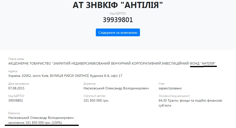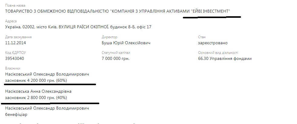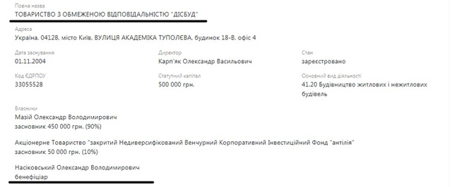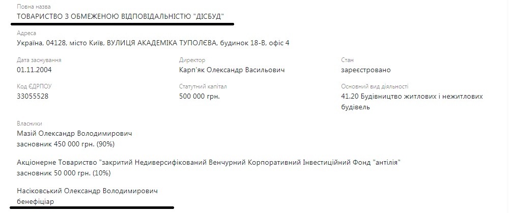 Внимательный читатель может спросить – а при чем здесь Насиковский? Ведь речь идет о каких-то «Дисбуд» и прочих непонятных ООО. Но дело в том, что владельцами ООО «Дисбуд» является Александр Мазий и АО «Закрытый недиверсифицированный венчурный корпоративный инвестиционный фонд «Антилия», владельцем которого, в свою очередь, является основатель и управляющий партнер девелоперской компании DIM Group Александр Насиковский. Ксати, его брат – Андрей Насиковский – был одним из подозреваемых по делу об избиении Татьяны Черновол. Но это так, к слову.