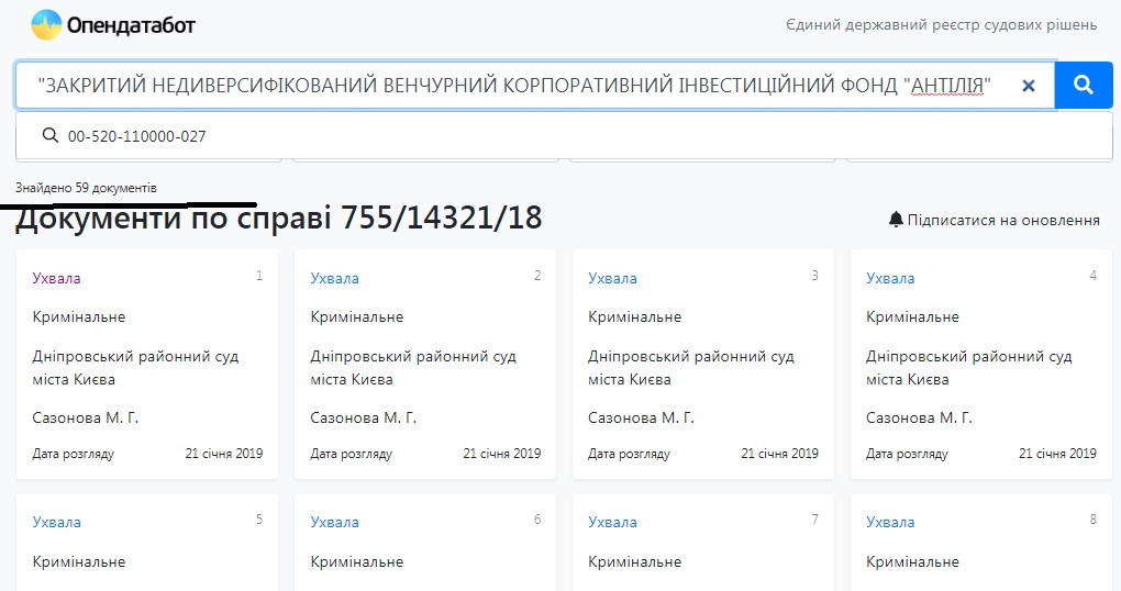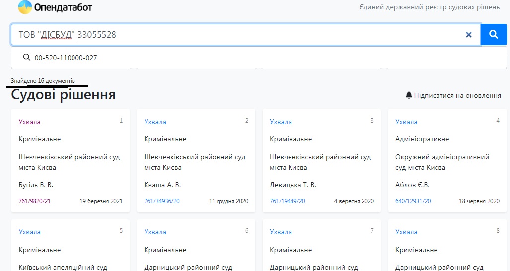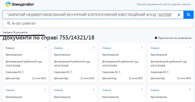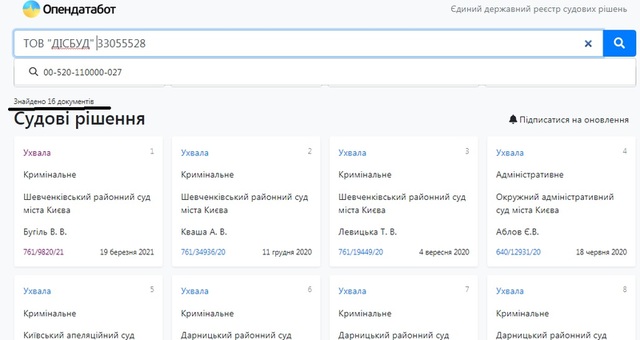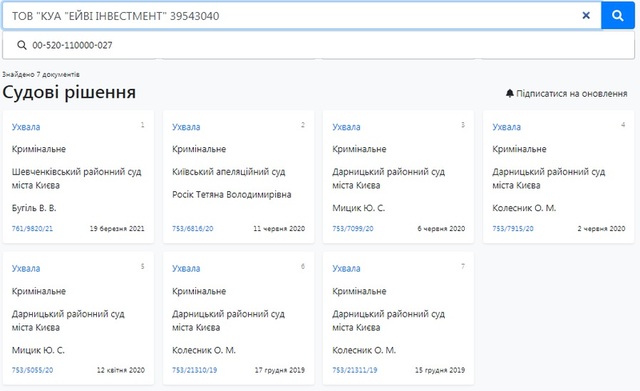 И все эти компании являются фигурантами уголовных производств. «КУА «Эйви Инвестмент» имеет в своем активе семь решений, «Антилия» фигурирует в 59 документах по уголовных делам, а «Дисбуд» может похвалиться 16 разнообразными судебными решениями. И налоговым долгом в 1 216 814, 04 гривны по состоянию на 1 марта 2021 года.