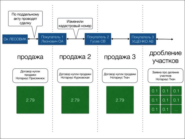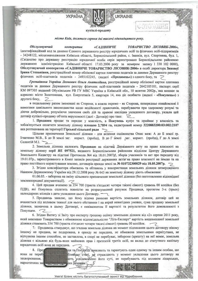Как выяснилось позже, неустановленные лица еще в 2011 году заключили договор продажи от имени «Лисовика». Согласно сделке участок размером в 2,79 гектар был передан гражданке Украины Ольге Леонович. Экспертная оценка данного участка составила 354 700 гривен. Однако есть несколько фактов, которые говорят о том, что документ может оказаться поддельным.