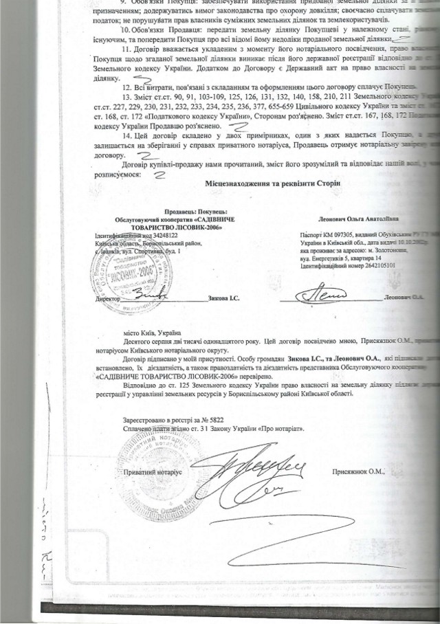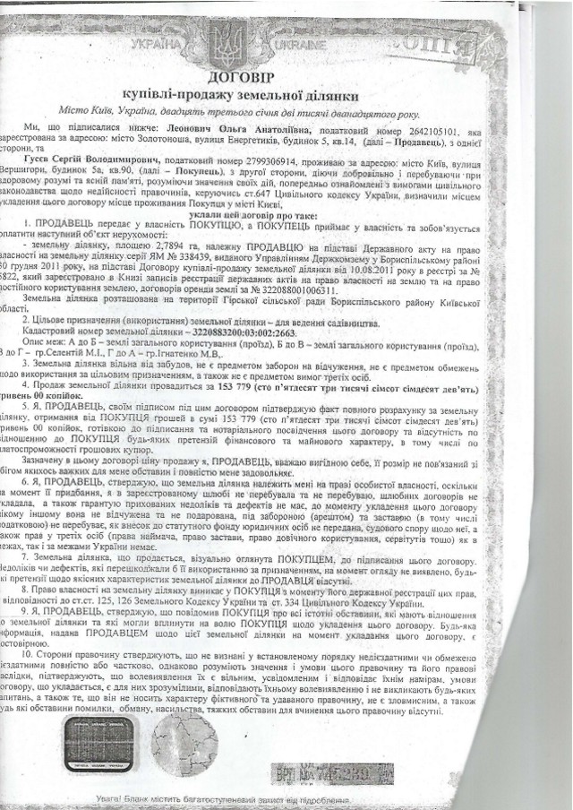 В 2012 году по другому договору Леонович перепродала этот участок киевлянину Сергею Гусеву. Сумма, обозначенная в документе, – 159 779 гривен.