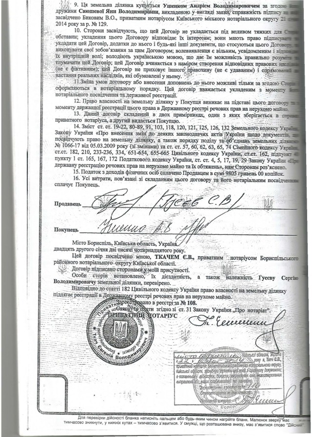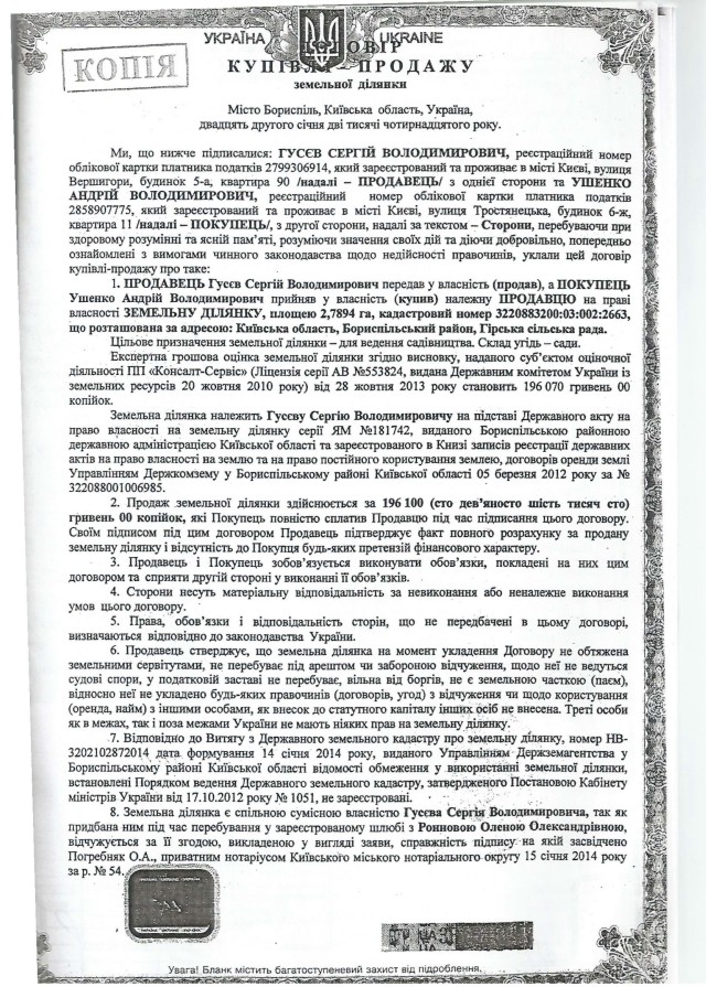 Дальше землю снова перепродали. Продавцом выступил уже известный Гусев. Покупателем – также киевлянин Андрей Ушенко. Нотариус, заключавший сделку, – Евгений Ткач.