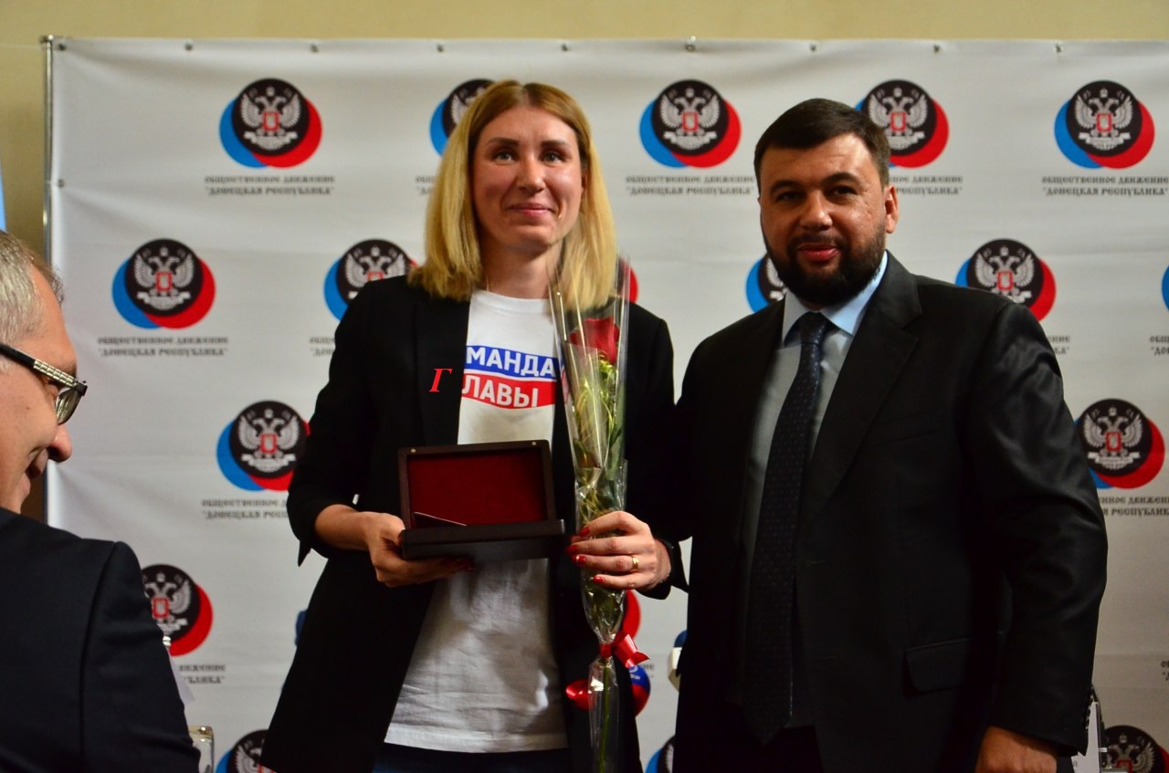 Кстати, она же получила "знак отличия" "за заслуги перед дрындыды" из рук пушилина. Обратите внимание на то, что написано у нее на футболке. Думаю, фотограф полюбому уехал на подвал за такое