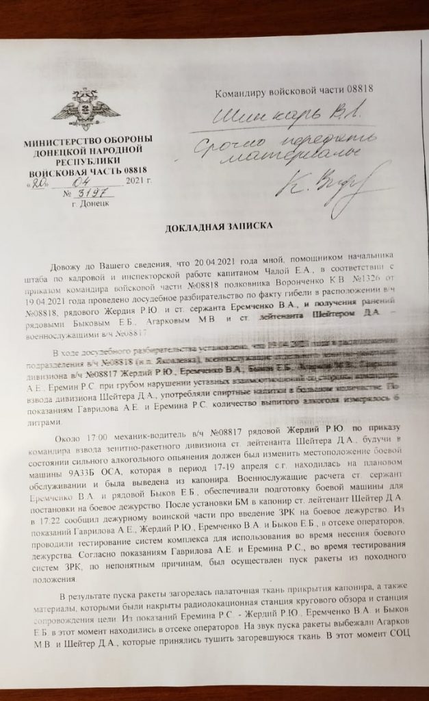 События произошли 19 апреля 2021 года, говорится в докладной записке представителя незаконных вооруженных формирований так называемого «помощника начальника штаба» одной из «военных частей» НВФ «ДНР» Е. Чалой.