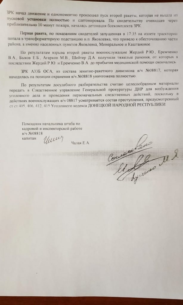 В докладной уточняется, что в результате выстрелов уничтожена ЗРК А33Б «ОСА», погибли два члена НВФ, трое получили ранения. А также обесточены н.п. Яковлевка, Минеральное и Каштановое.