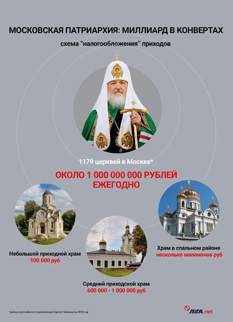 Це статистика на 2018-й. З огляду на те, що в російській столиці було 1179 церков, патріархія отримує від них близько мільярда рублів щороку ($13,3 млн). І це тільки в Москві.