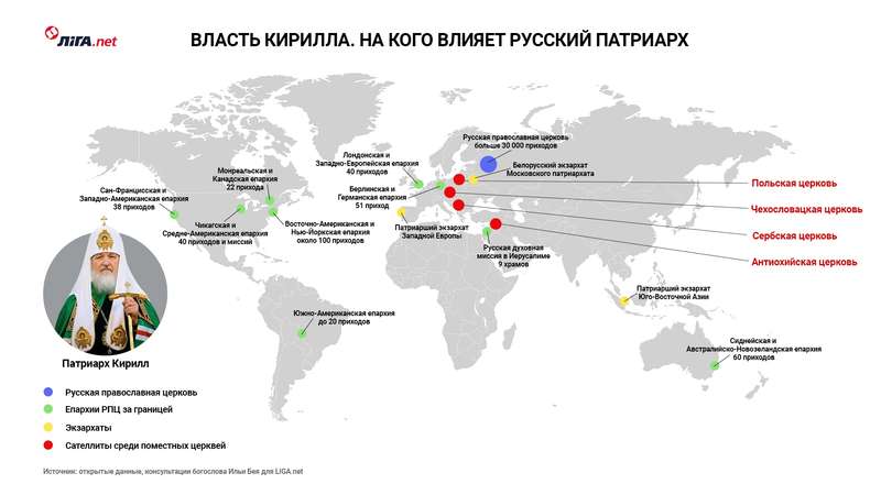 "Сфера впливу РПЦ з кожним роком скорочується, – підтверджує богослов Бей. – І серед православних церков теж". Фактично, стверджує він, в руках у Кирила залишилися тільки три-чотири ниточки: помісні церкви Чехії та Словаччини, Польщі, Сербії та (дуже умовно) Болгарії: "Річ в тім, що в Болгарії та Сербії, які близькі до Греції, вище духовенство вже отримує переважно грецьку освіту. І все більше дихає у бік Греції та патріарха Варфоломія. А завербоване ще за союзу КДБ-лобі втрачає владу".