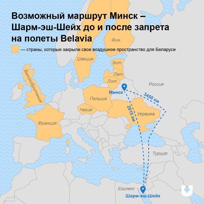 Кроме того, журналисты составили предварительную карту того, как могут выглядеть маршруты на популярные курорты после запрета Belavia влетать в воздушное пространство ряда стран.
