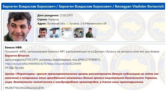 По данным сайта «Миротворец», Владислав Барсегян в 2014-ом организовал блокпост террористов ЛНР №7 на улице Дачная в Луганске. Там же стоял его сын Виталий – также боевик.