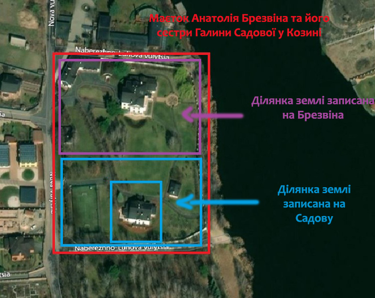 Галина Садова та Анатолій Брезвін не втратили тісних родинних зв’язків, як інколи буває серед родичів, навпаки, стосунки настільки глибокі, що вони на дві родини збудували спільний маєток в елітному Козині. Галина отримала 2018 року у власність понад 51 сотку землі на самому березі річки Козинка. Поряд ділянку у 62 сотки отримав Анатолій. Лише за два роки там зведено два елітні будинки, тенісний корт та кілька господарських будівель. Між цими будівлями немає жодної видимої межі і зведені вони всі в одному архітектурному стилі. Брат і сестра також привласнили і ділянку пляжу більш ніж 5 соток відповідно до кадастрової карти.