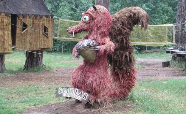 Ось таку білочку два з половиною метри заввишки було встановлено у парку “Партизанської слави” на початку літа 2013 року. Нам не вдалося встановити скільки дітей довелося потім водити до народних цілителів “виливати переляк”, адже крім цієї білочки, по всій столиці були встановлені скульптури коника, солом’яного бичка, вовка та орла. Вартість цих робіт встановити не вдалось, однак вочевидь вони були проведені із корупційною складовою.