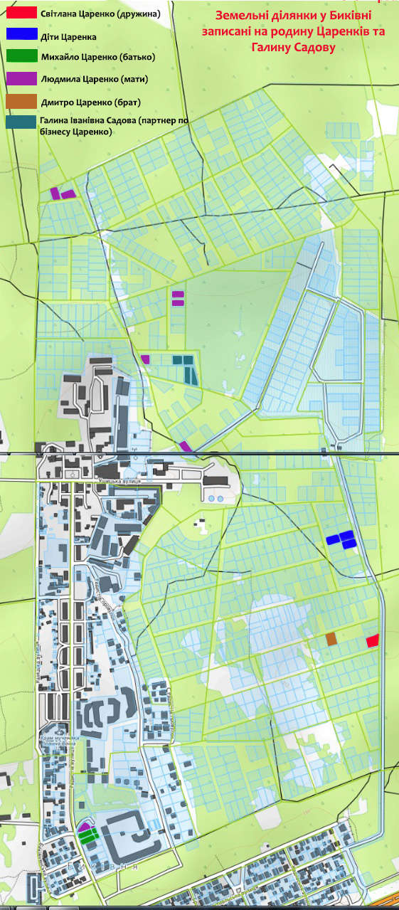 Загалом 21 ділянка зосереджена в руках родини Царенків, що вже б мало бути фактом розслідування, адже Київрада у 2016 році розділила 176 гектарів земель Биківні на 226 ділянок для сімей загиблих бійців АТО, сімей загиблих Героїв Небесної Сотні, паралімпійців та афганців. Як вдалося з’ясувати, жоден член родини Царенків не підпадає під ці категорії.