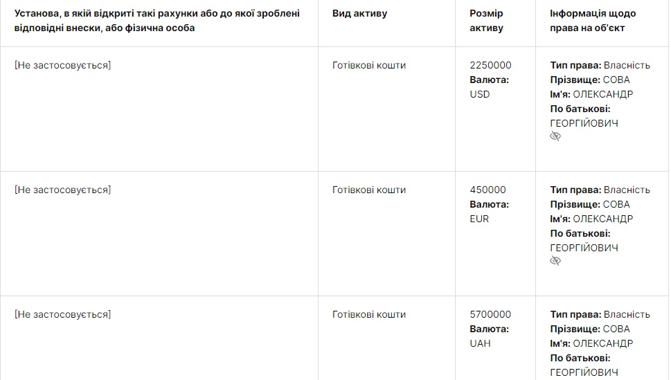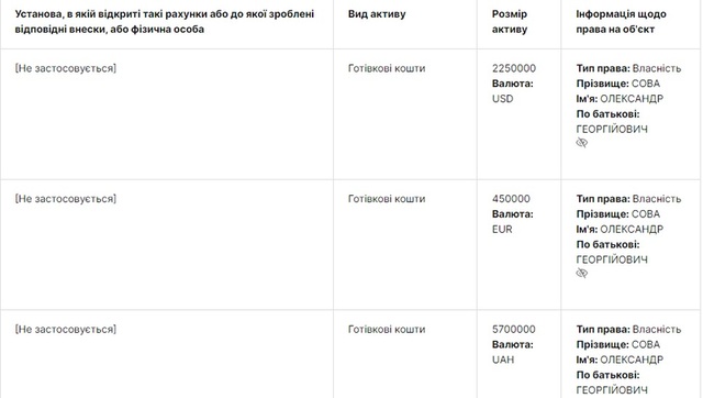 Всего же Александр Сова хранит дома наличными 2,7 миллиона долларов, 450 тысяч евро и 14 миллионов гривен.