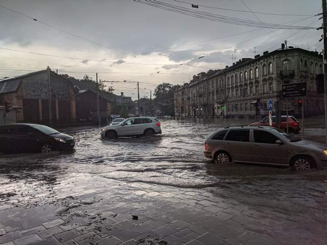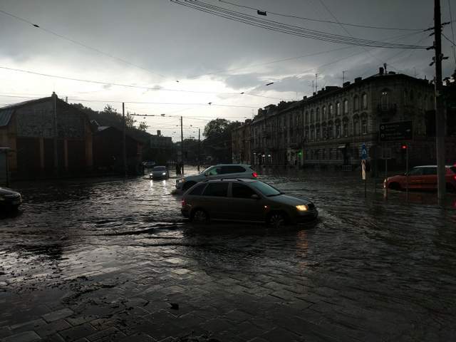 Улицу сильно затопило, обойти воду невозможно. Автомобили пытаются проехать, однако не всем это удается. В частности, в воде застряла машина службы такси Opti. Спасатели были вынуждены толкать ее.