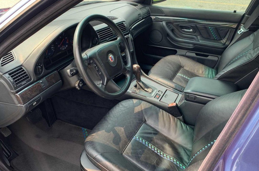 По утверждению продавца, автомобиль имеет оригинальное состояние — с фирменными многоспицевыми колесами Alpina, заводской окраской кузова, отделкой салона березовым шпоном и натуральной кожей с сине-зелеными вставками.