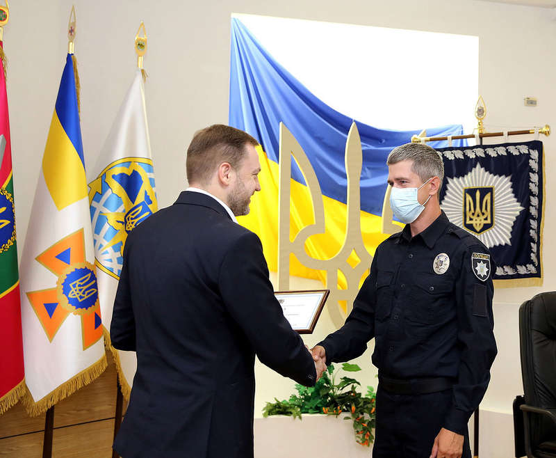 Министр внутренних дел Украины Денис Монастырский наградил часами и объявил благодарность работникам Управления патрульной полиции в городе Киеве, которые 16 июля в Дарницком районе столицы, рискуя собственной жизнью, спасли человека.